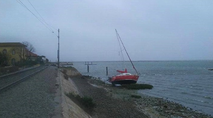 Este veleiro encalhou junto da muralha exterior do Ginásio Clube Naval de Faro (GCNF), próximo da linha do comboio, devido às condições meteorológicas adversas que se faziam sentir no Sábado.