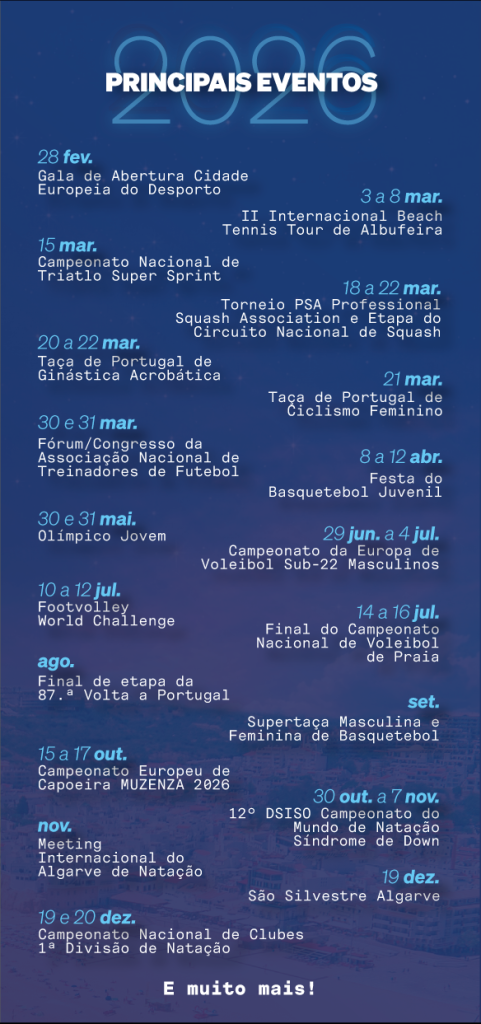 O presidente adiantou, igualmente, que a Gala de Abertura “Albufeira Cidade Europeia do Desporto 2026” terá lugar no próximo dia 28 de fevereiro, pelas 17h00, assumindo-se como o momento inaugural deste ciclo. “Será o grande marco e o pontapé de saída de um conjunto de eventos que vai, certamente, projetar o bom nome de Albufeira além-fronteiras, numa cerimónia preparada ao detalhe, digna da distinção e fiel à identidade dos albufeirenses”, concluiu.